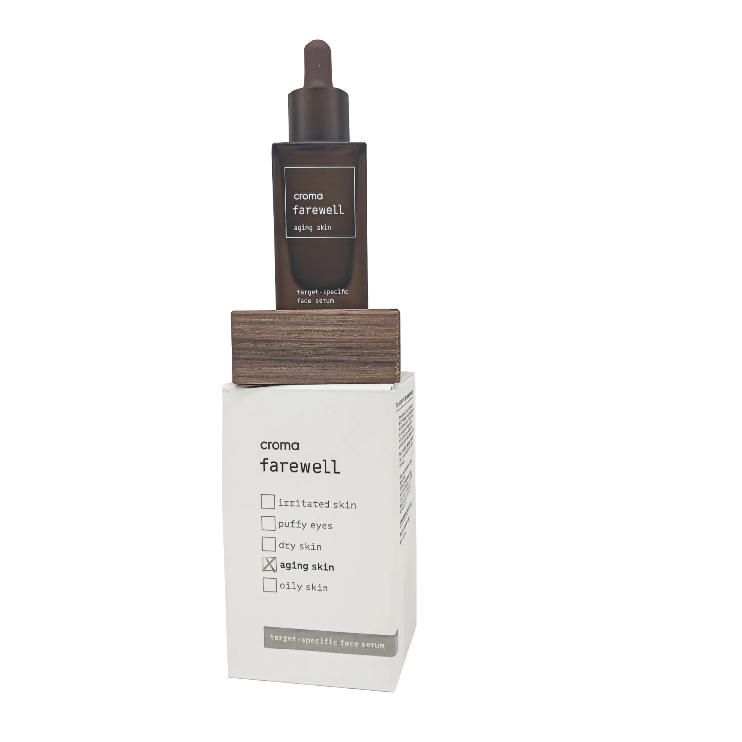 Croma Farewell – Aging Skin est un sérum formulé avec de l’acide hyaluronique et des extraits de ferments marins. Ce produit est végan, cruelty-free, et fabriqué en Autriche.