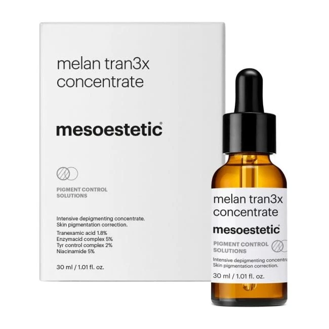 Mesoestetic Melan Tran 3x Concentrate est un concentré dépigmentant destiné à réduire l’apparence de l’hyperpigmentation et à atténuer les taches brunes. Sa formule contient de l’acide tranexamique et des acides exfoliants tels que l’acide mandélique, salicylique et lactique, qui contribuent à réguler la production de mélanine et à améliorer l’aspect de la peau.