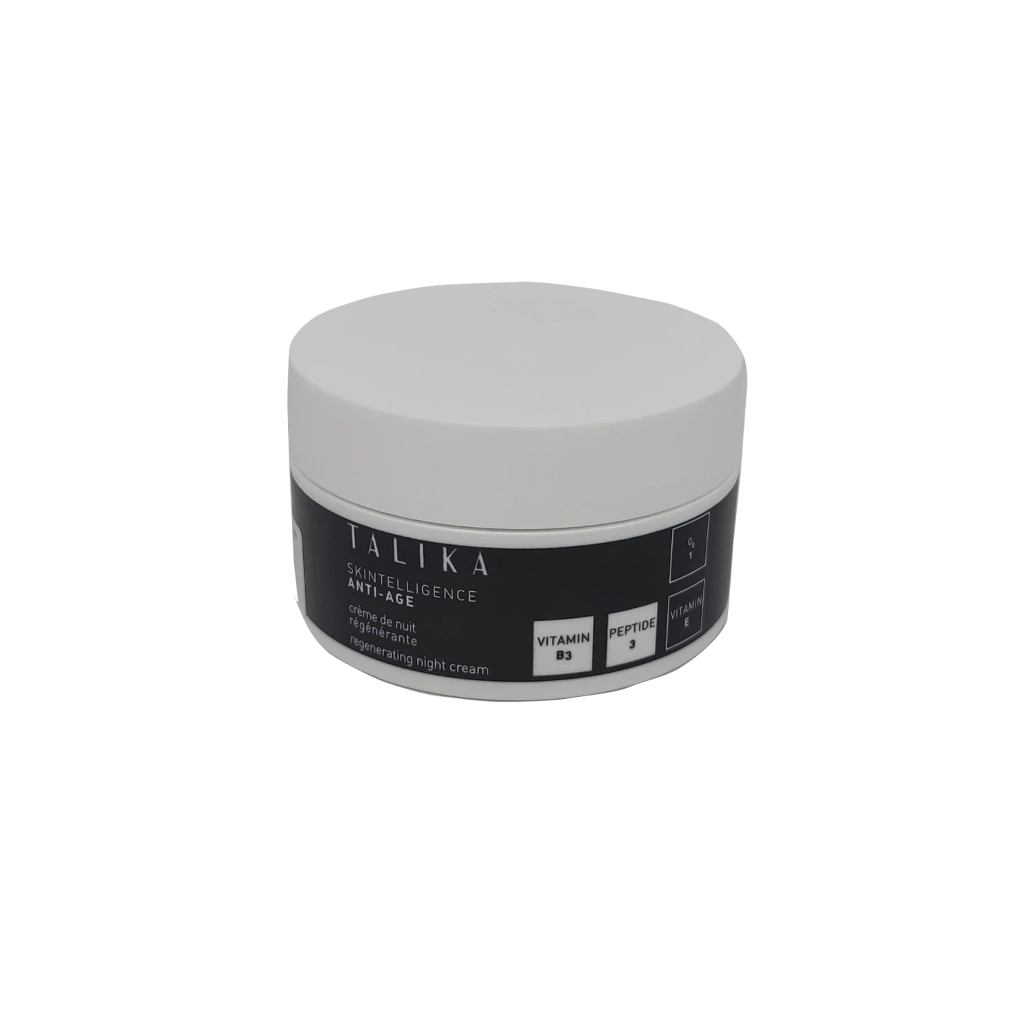 La crème de nuit régénérante Talika fait partie de la gamme Skintelligence. Sa formule contient des prébiotiques, des huiles d’argan et de coco ainsi que d’autres ingrédients actifs destinés à soutenir l’équilibre du microbiome cutané et à favoriser le renouvellement cellulaire. Après application, la peau peut paraître plus reposée et les traits plus lissés.